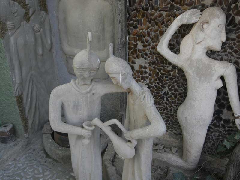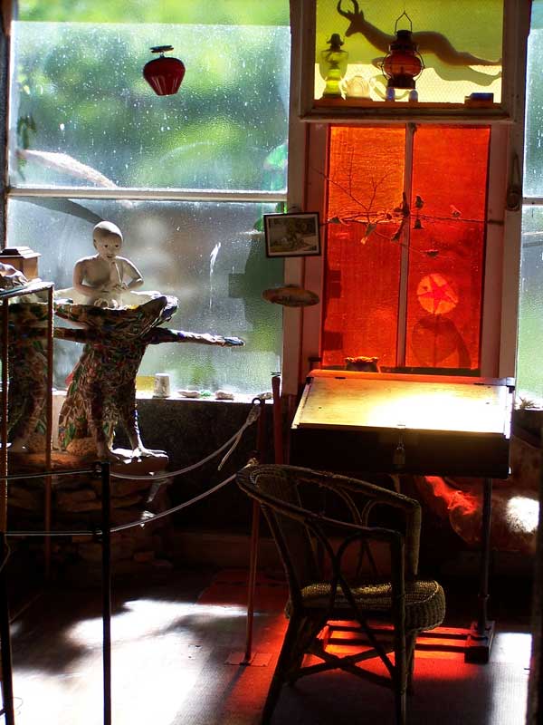 Over the years, she and various assistants (the most famous being Koos Malgas) worked to create a multi-coloured house and fantasy garden of concrete and ground glass sculptures. Inside the Owl House, walls are encrusted with ground glass, mirrors are placed to catch light at different times of day and lanterns and candles arranged to bounce their light onto the mirrors. In the Camel Yard, scores of statues – many of them wise men and camels – face East, towards a Mecca of sorts.